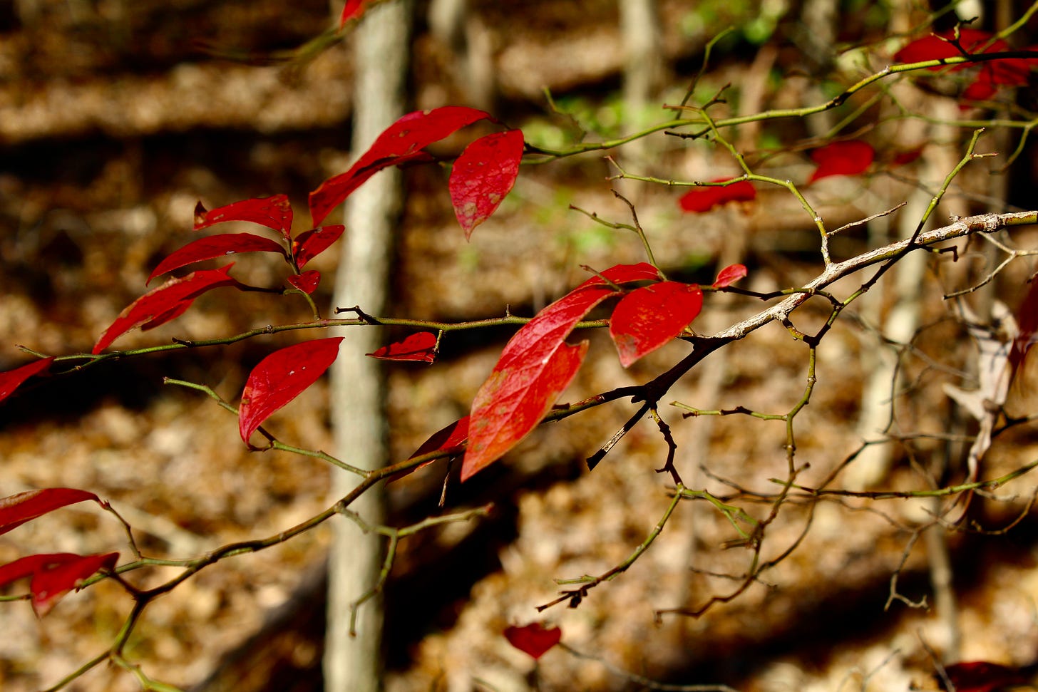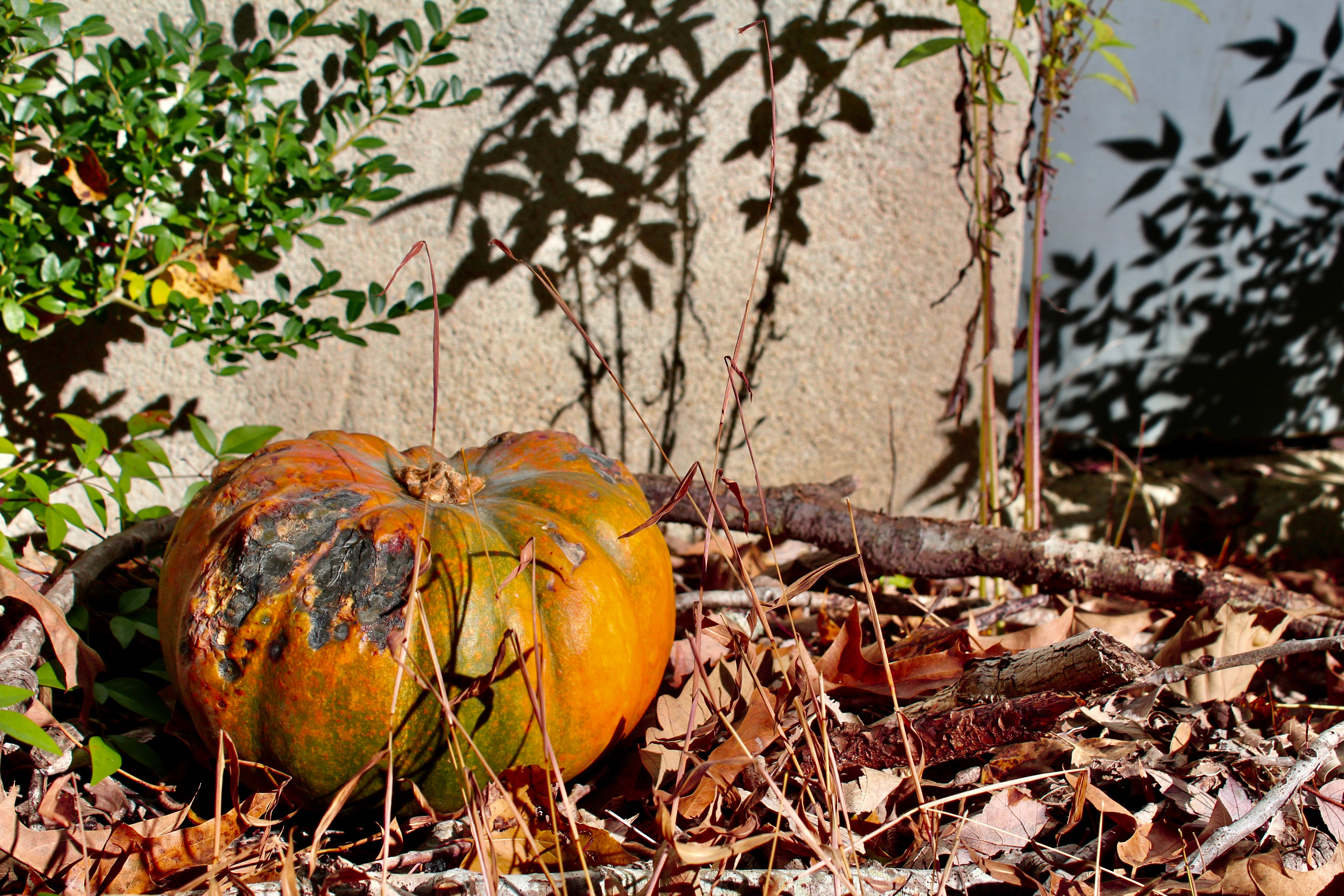 (The photos are of ferns my friend gave me for an early Christmas present, a moldering squash from Halloween that went bad before I could roast it, and a tree that lives near my house with its November dressings.)